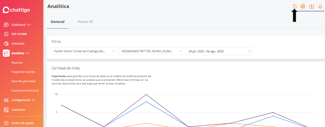 Dentro de la plataforma podemos buscar los Chats cerrados entrando al módulo de Analítica y seleccionamos la opción de Resumen y en la pantalla que aparece tenemos buscamos el primer icono como se muestra en la imagen: