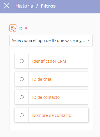 Para las opciones de búsqueda de ID de Chat, solo es necesario agregar el ID. Para las demás opciones de Identificador CRM, Id de contacto y Nombre de contacto aparece el siguiente formulario una vez que se selecciona alguna de las opciones: