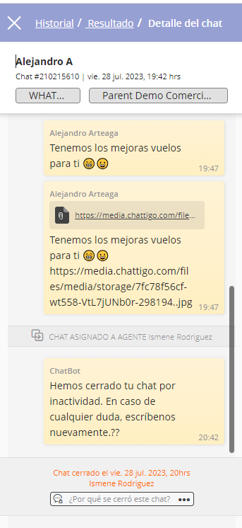 Si se le da clic a la conversación, aparecen los mensajes enviados dentro de la conversación, información del contacto, quien cerro la conversación, campaña, canal y cuando inicio la conversación: