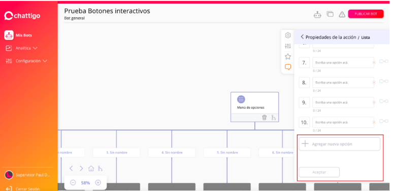 - Solo se podrán agregar 10 opciones a la lista interactiva. Una vez que llegues a agregar la opción número 10 el botón “+ Agregar opción” y “Aceptar” se visualizarán apagados sin posibilidad de agregar más opciones.