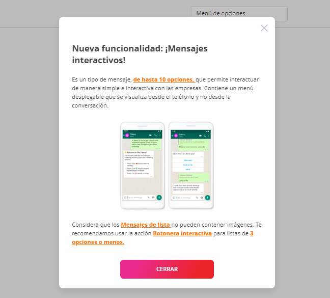 Las listas de opciones interactivas sólo están disponibles para el canal de WhatsApp,