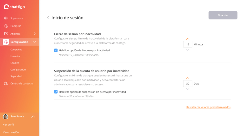- Cierre de sesión por inactividad: Establece un tiempo máximo de inactividad en tu perfil, que puede ir de 15 a 180 minutos. Si no haces un click o no realizas acciones en la plataforma durante el tiempo que hayas elegido, tu sesión se cerrará. La cuenta de supervisor no se bloquean por inactividad.