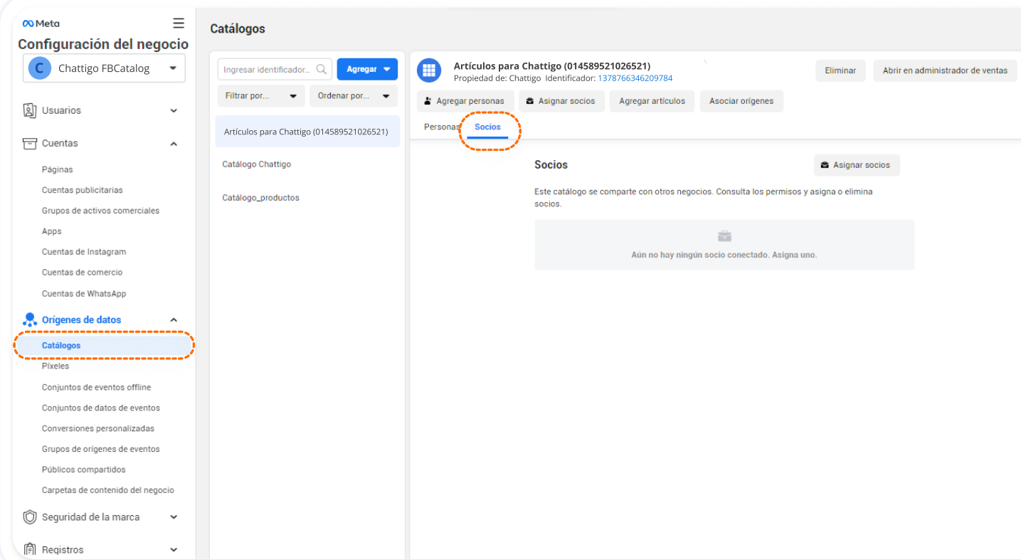 3. Una vez elegido el catálogo a conectar, haz clic en "Asignar socios' y selecciona la opción Identificador del negocio :