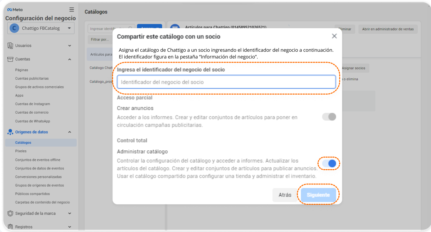 4.El "Identificador del negocio" debe ser el de chattigo (588365771531610).