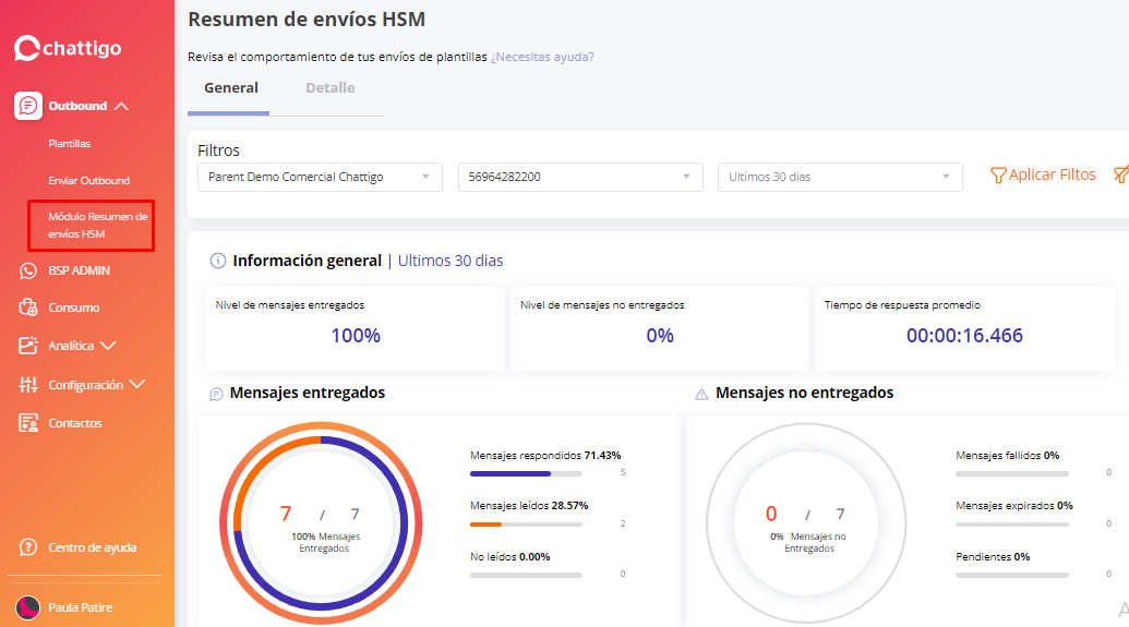 Podrás ver el resumen de los envíos HSM que realices en un período de tiempo dado. Visualiza fácil y rápidamente los datos generales y el detalle de cada envío a través de estadísticas y representación gráfica. 📊