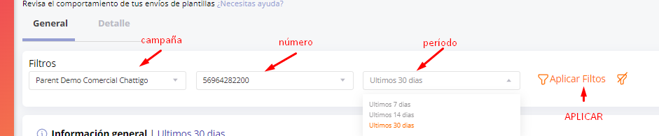 Allí podrás colocar los filtros deseados de campaña, número de teléfono desde donde se realizó el envío, período a analizar (últimos 7, 14 ó 30 días) y luego dar clic en "Aplicar Filtros" :